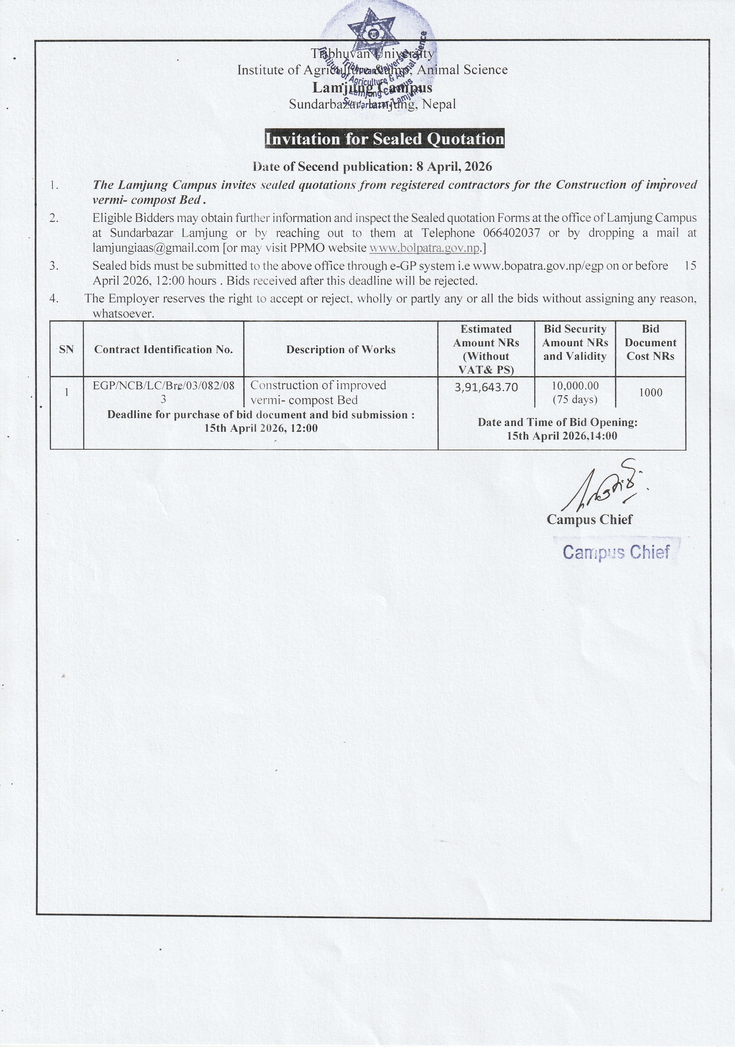 Invitation for Sealed Quotation of Vermi Compost