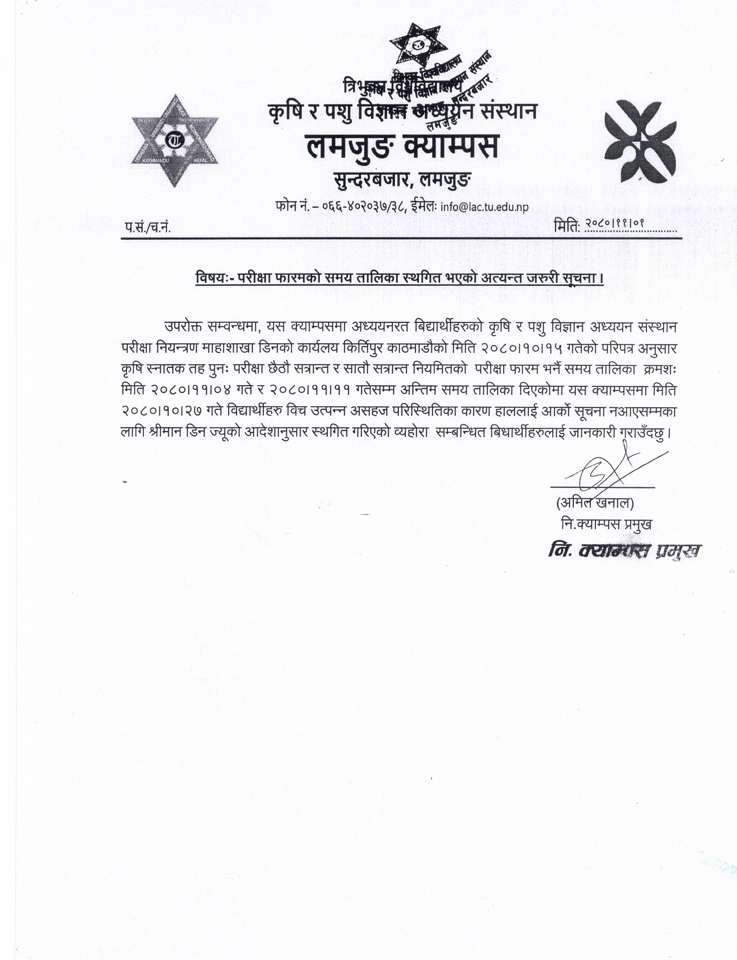 परीक्षा फारमको समय तालिका स्थगित भएको सूचना