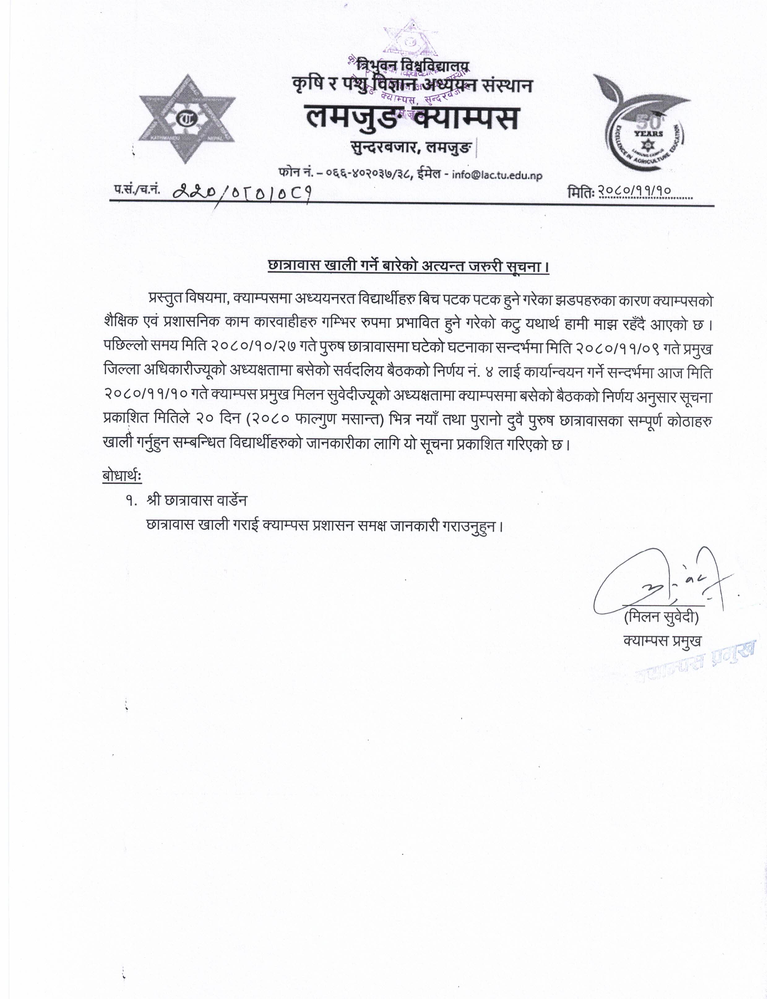 पुरुष छात्रावास खाली गर्ने बारेको अत्यन्त जरुरी सूचना