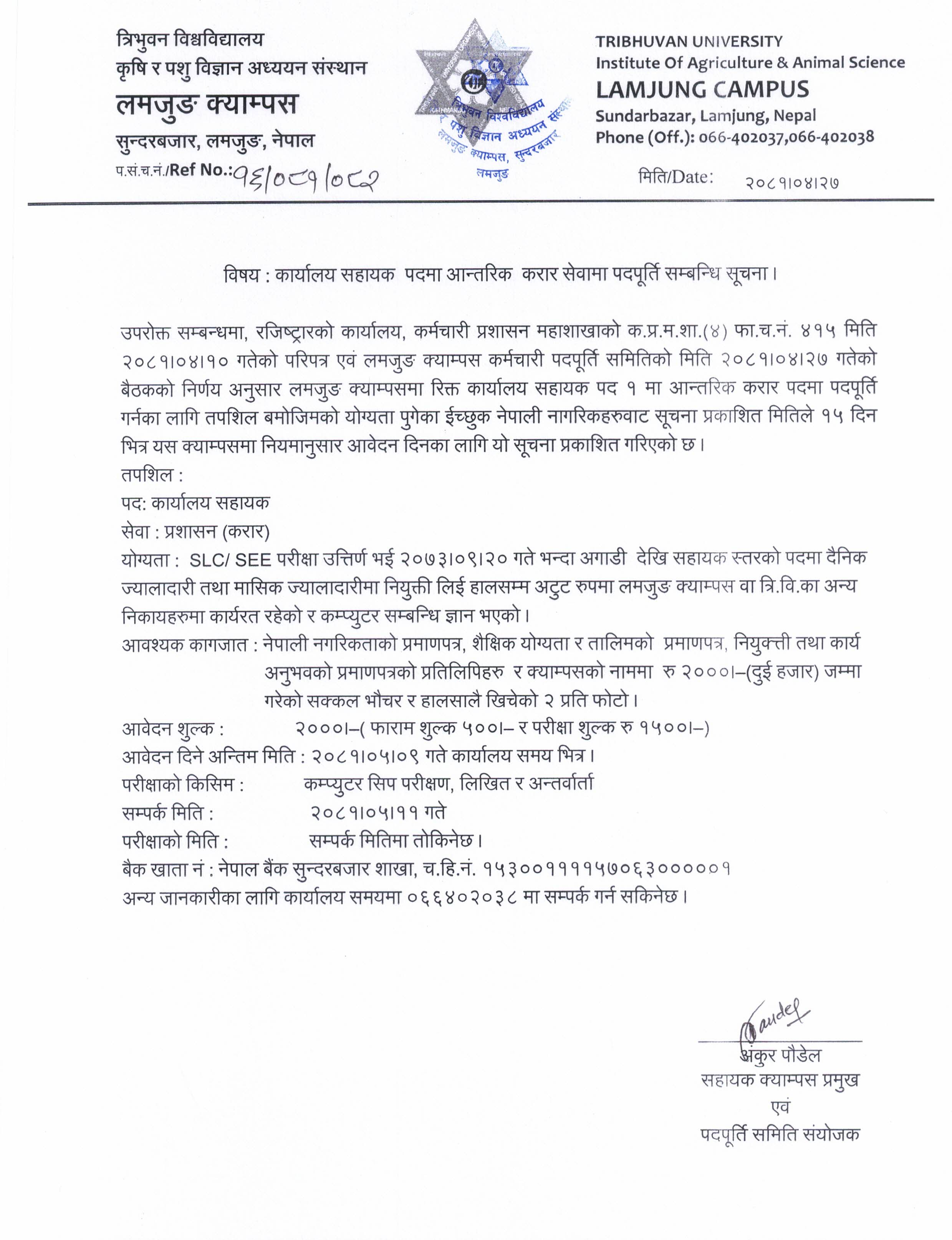 कार्यालय सहायक पदमा करार सेवामा पदपूर्ति सम्बन्धी सूचना